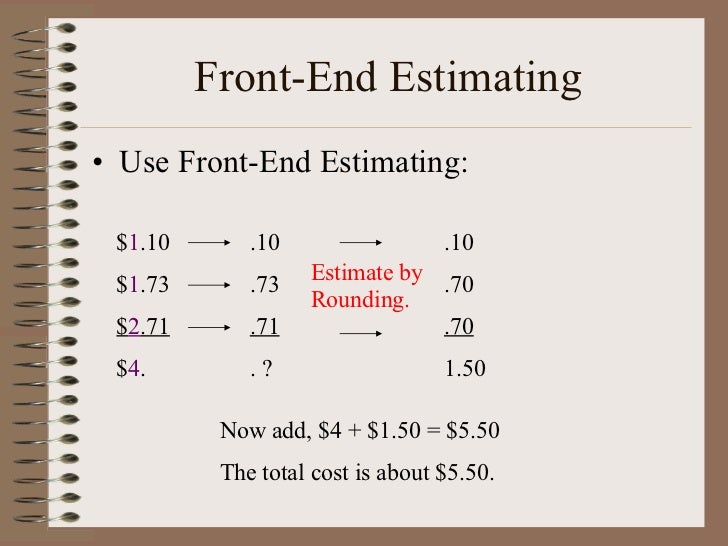 Front end estimation involves rounding off a number to the leftmost place and using that in the addition problem. With front end estimation 43 52 becomes 40 50. Front End Estimation is a way of estimating the sums differences or products of numbers by rounding.